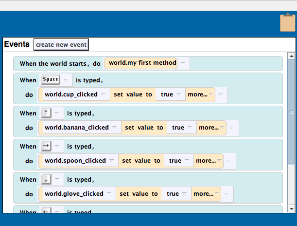 Also, illustrate to them how Alice events work, connect a banana to space on the makey then create an event: when a space is pressed, banana turns visible. Here are some examples of this: