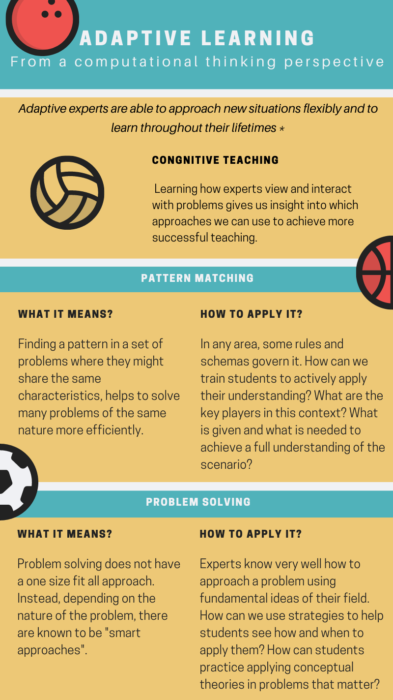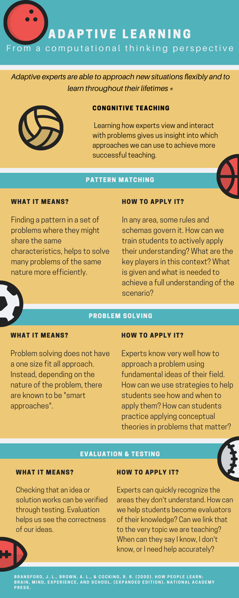 This infographic aims to explain computational thinking in the light of Cognitive Learning Theories. Adaptive learning refers to experts’ skills in developing a learner’s knowledge. Reflecting on these theories in the context of my field developed my understanding and awareness of their importance and implications. As a result, enhancing my analytical skills of our practices as educators.